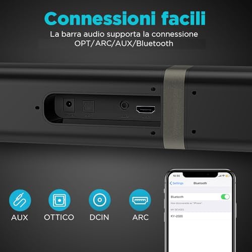 Dotato di altoparlanti Bluetooth 5.3, il KY2020D offre una connessione wireless stabile e veloce, permettendoti di riprodurre la tua musica preferita senza fili. Le opzioni di connessione includono ARC, Optical e AUX, garantendo compatibilità con una vasta gamma di dispositivi.